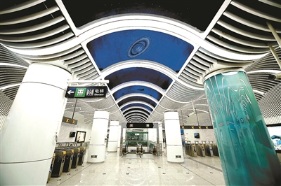 “整條線主要體現(xiàn)了‘門中觀軸’的概念,永定門外、大紅門站廳里都有城門設(shè)計(jì)。中心城區(qū)里的三站,我們采用古曲紅和灰色的概念來(lái)設(shè)計(jì);再往南走的站,逐漸會(huì)變化為黃色、藍(lán)色、綠色;木樨園過(guò)去有過(guò)麋鹿,所以我們?cè)O(shè)計(jì)了花草;海戶屯過(guò)去是獵場(chǎng),我們?cè)O(shè)計(jì)了八匹駿馬……”2018年歲末,貫穿南中軸的地鐵8號(hào)線三期南段和四期共將開(kāi)通13站。昨天,北京青年報(bào)記者提前感受了這條特別的地鐵線路。一站一個(gè)景觀,從古代城門穿越到天空之門,從天橋壁畫再到宇航視野,坐上地鐵就好似從老北京向新北京“穿越”。