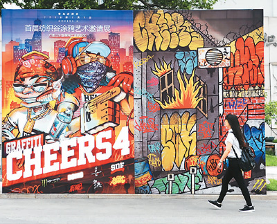圖為游客走過(guò)青島紡織谷涂鴉宣傳畫(huà)前。 王海濱攝(人民視覺(jué))