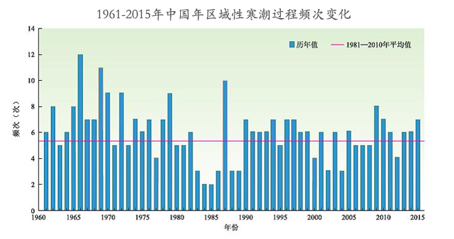 1961-2015年中國(guó)年區(qū)域性寒潮過(guò)程頻次變化 圖片數(shù)據(jù)來(lái)源:國(guó)家氣候中心