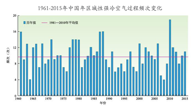 1961-2015年中國(guó)年區(qū)域性強(qiáng)冷空氣過(guò)程頻次變化 圖片數(shù)據(jù)來(lái)源:國(guó)家氣候中心