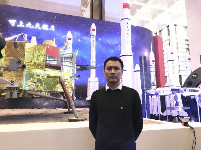 何巍在“偉大的變革——慶祝改革開放40周年”大型展覽的長征系列火箭展區(qū),接受媒體采訪。新華社記者屈婷攝