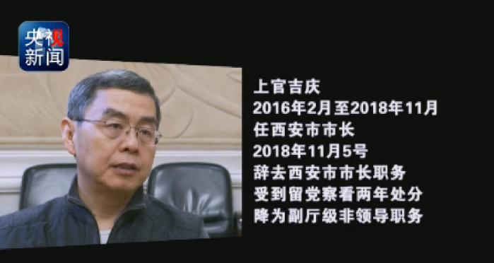 上官吉慶,2016年2月至2018年11月任西安市市長(zhǎng),2018年11月5號(hào)辭去西安市市長(zhǎng)職務(wù),受到留黨察看兩年處分,降為副廳級(jí)非領(lǐng)導(dǎo)職務(wù)。