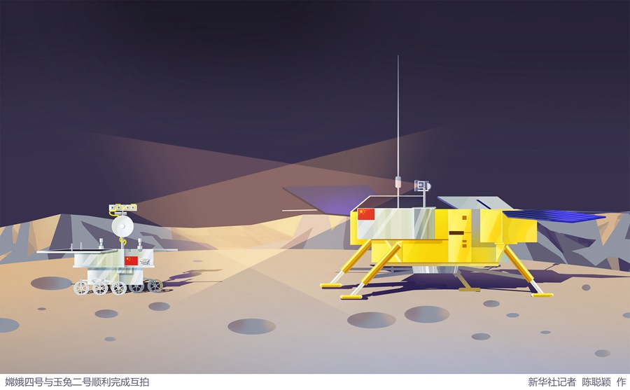 插畫(huà):嫦娥四號(hào)與玉兔二號(hào)順利完成互拍 新華社記者 陳聰穎 作
