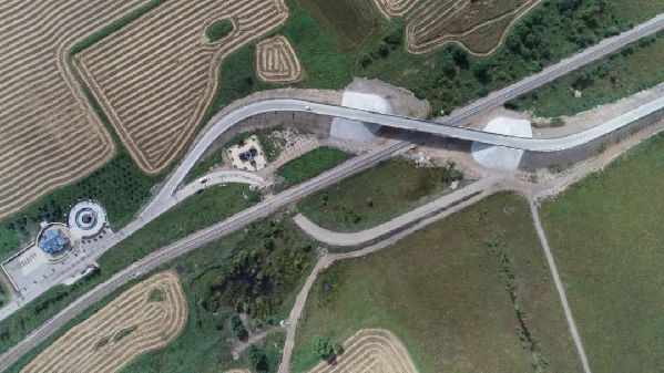 平改立工程K11公里道口,已建成的沙土橋梁??梢钥吹较聵虻妮o路和橋梁之間,完全沒(méi)有預(yù)留轉(zhuǎn)彎的空間。(8月28日 航拍圖)達(dá)日罕攝