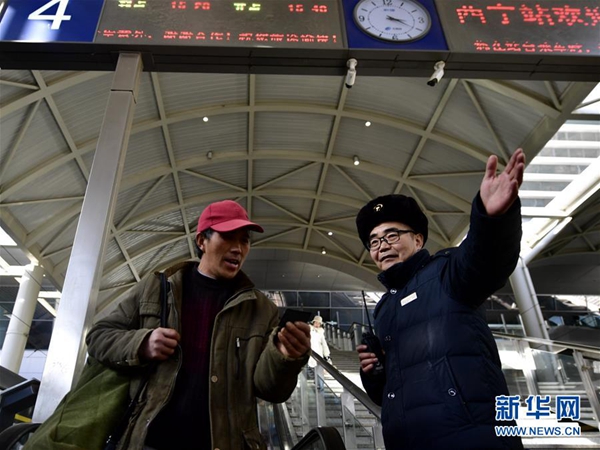 1月16日,李海云在西寧站引導(dǎo)旅客乘車。新華社發(fā)(張龍 攝)