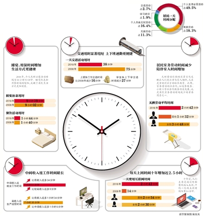 2018年,國(guó)家統(tǒng)計(jì)局組織開展了第二次全國(guó)時(shí)間利用調(diào)查,該調(diào)查覆蓋11個(gè)?。ㄊ校?,采用國(guó)家統(tǒng)一的住戶收支與生活狀況調(diào)查樣本框,共抽樣調(diào)查20226戶48580人。昨日,《2018年全國(guó)時(shí)間利用調(diào)查公報(bào)》出爐,結(jié)果顯示,與2008年相比,中國(guó)居民的時(shí)間分配結(jié)構(gòu)發(fā)生了較大變化,睡覺休息和用餐時(shí)間增加,收入越低的居民看電視時(shí)間越多,每天上網(wǎng)時(shí)間增加2小時(shí)28分鐘。