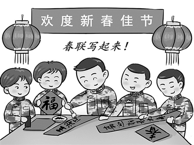 無論鄉(xiāng)村還是城市,春節(jié)家家戶戶都要張燈結(jié)彩。放鞭炮、貼春聯(lián)、逛廟會,其樂融融。能文能武的戰(zhàn)士們,此時也會提筆蘸墨,書寫、張貼春聯(lián)和“?!弊郑烟炷虾1钡淖姞I裝點(diǎn)出濃濃年味。