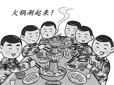 年夜飯,是中國人春節(jié)最溫暖的儀式。在軍營,如果除夕晚上能與戰(zhàn)友們圍坐一起,涮頓熱氣騰騰的火鍋,也有著特別的味道。那火辣辣的滋味,吃在嘴里,暖在心上,洋溢著滿滿的戰(zhàn)友情深。(姜 晨/繪 朱夢圓/文)
