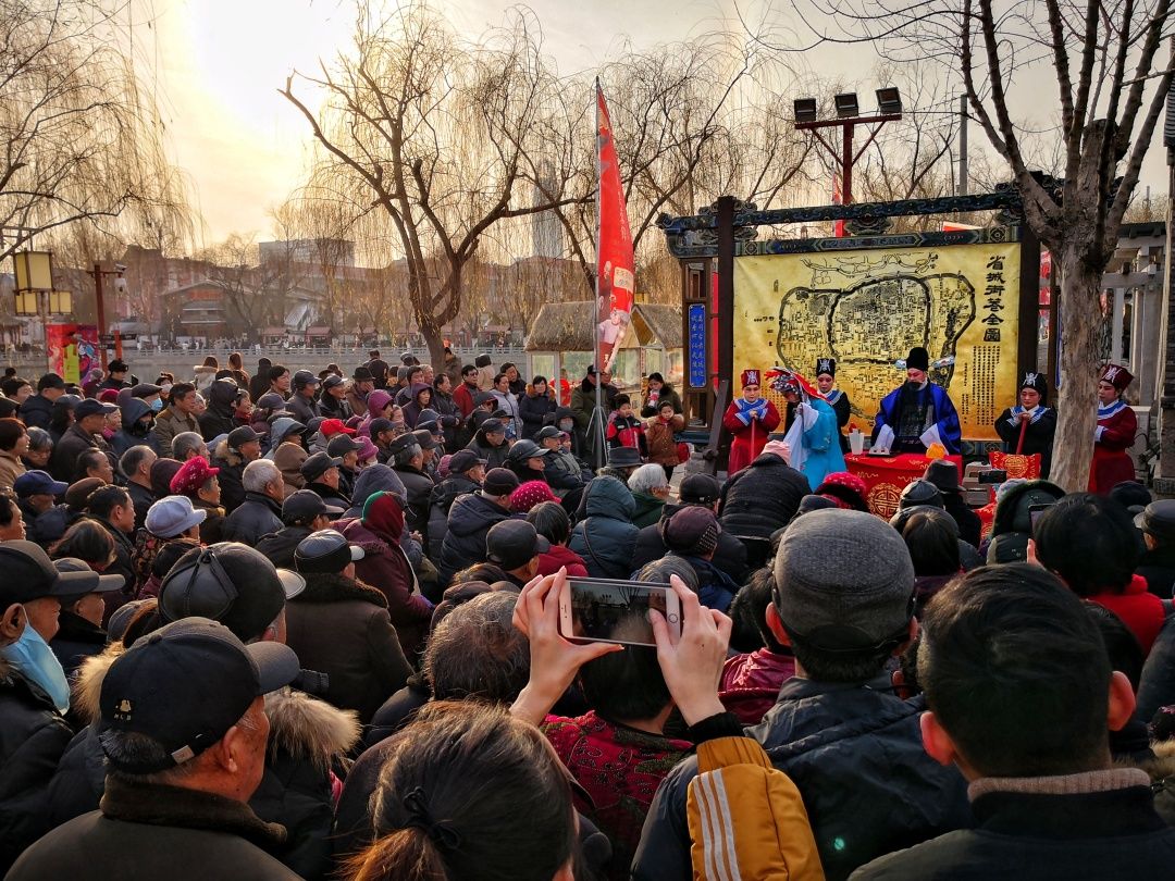 2019-01-05,山東省濟(jì)南市百花洲。臨近春節(jié),在濟(jì)南百花洲畔,非遺地方戲曲展演正在上演,吸引過(guò)往游人層層圍觀、駐足叫好。作者:地伐