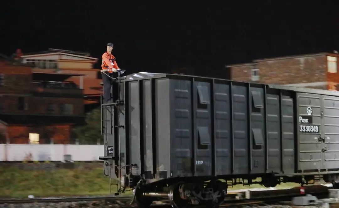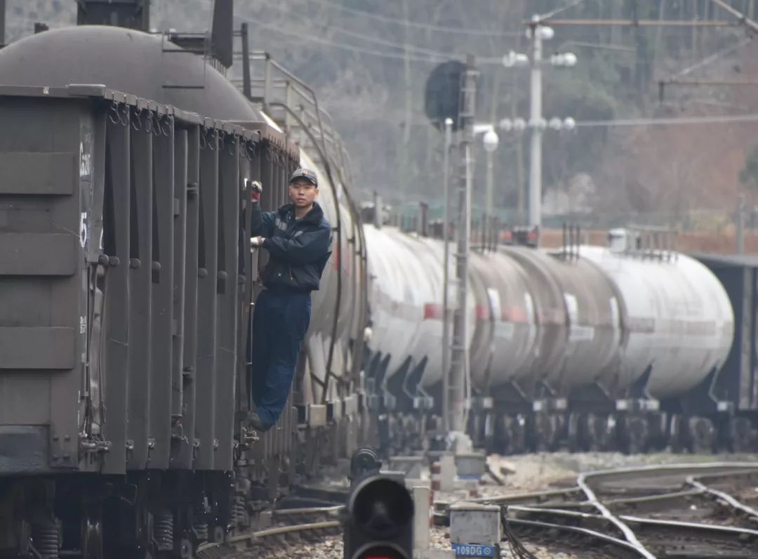 2019-02-02,長沙車務(wù)段路口鋪車站。在搶運航油、汽油等油品的專列上,連接員掛在車梯上編組列車。作者:麥子熟了