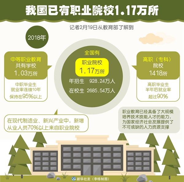 新華社北京2月19日電(記者胡浩)記者19日從教育部了解到,2018年,全國(guó)有職業(yè)院校1.17萬(wàn)所,年招生928.24萬(wàn)人,在校生2685.54萬(wàn)人。職業(yè)教育已經(jīng)具備了大規(guī)模培養(yǎng)技術(shù)技能人才的能力,為國(guó)家經(jīng)濟(jì)社會(huì)發(fā)展提供了不可或缺的人力資源支撐。