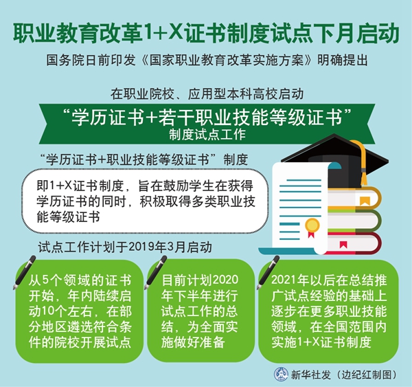 “職教20條”提出,從2019年開始,在職業(yè)院校、應用型本科高校啟動“學歷證書+若干職業(yè)技能等級證書”制度試點(以下稱1+X證書制度試點)工作。試點工作要進一步發(fā)揮好學歷證書作用,夯實學生可持續(xù)發(fā)展基礎,鼓勵職業(yè)院校學生在獲得學歷證書的同時,積極取得多類職業(yè)技能等級證書,提高就業(yè)創(chuàng)業(yè)本領,緩解結構性就業(yè)矛盾。
