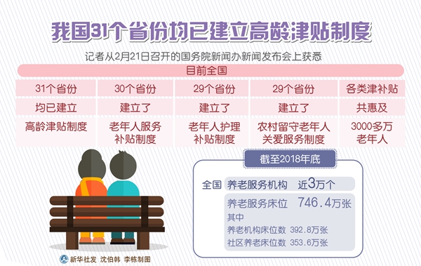 新華社北京2月21日電(記者羅爭光)記者從21日召開的國務(wù)院新聞辦新聞發(fā)布會(huì)上獲悉,目前全國31個(gè)省份均已建立高齡津貼制度。與此同時(shí),有30個(gè)省份建立了老年人服務(wù)補(bǔ)貼制度,29個(gè)省份建立了老年人護(hù)理補(bǔ)貼制度,29個(gè)省份建立了農(nóng)村留守老年人關(guān)愛服務(wù)制度,各類津補(bǔ)貼共惠及3000多萬老年人。