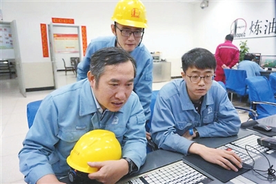 新招聘的高職生跟著中國(guó)石化技能大師孫同根學(xué)習(xí)操作技巧。陳康 攝