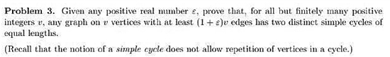 讓中國(guó)隊(duì)全軍覆沒的第3題,翻譯過(guò)來(lái)的大致意思是:給定任何一個(gè)正實(shí)數(shù)e,證明除了有限個(gè)正整數(shù)以外的所有正整數(shù)v,任何有v個(gè)頂點(diǎn)并且有大于等于 (1+e)v條邊的圖至少包含兩個(gè)不同的等長(zhǎng)簡(jiǎn)單回路。