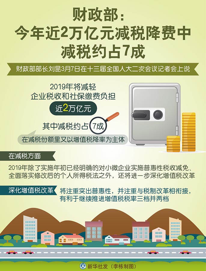 圖表:財(cái)政部:今年近2萬億元減稅降費(fèi)中減稅約占7成 新華社發(fā) 李棟 制圖