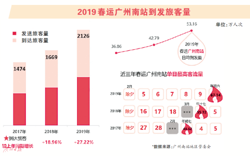 2019年春運(yùn)期間(1月21日至3月1日),廣州南站到發(fā)旅客2126.37萬(wàn)人次,日均旅客到發(fā)量53萬(wàn)人次,同比增長(zhǎng)24.23%,居全國(guó)第一。另外,今年廣州到達(dá)旅客量達(dá)1050.75萬(wàn)人次,較上年同期增長(zhǎng)27.22%,創(chuàng)近三年來(lái)最大增幅,春運(yùn)期間來(lái)廣州的旅客數(shù)不斷攀升。廣州南站客流峰值出現(xiàn)在2月10日(年初六),到發(fā)客流量達(dá)67.14萬(wàn)人次,較去年春運(yùn)峰值(55.72萬(wàn)人次)上升20.49%。