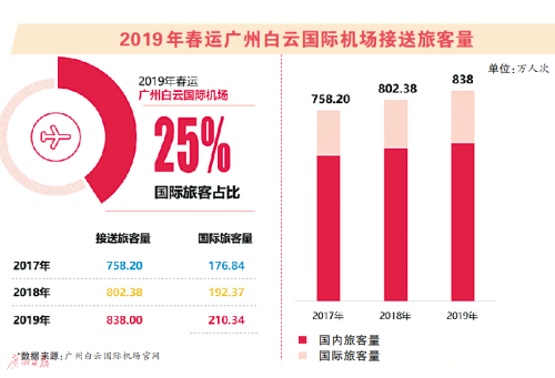2019年“反向春運(yùn)”現(xiàn)象的出現(xiàn)最直觀體現(xiàn)在春運(yùn)期間交通流向“進(jìn)出兩旺”的態(tài)勢(shì)。根據(jù)“春運(yùn)廣州”的數(shù)據(jù),2019年春運(yùn),在節(jié)前的春運(yùn)返鄉(xiāng)高峰,進(jìn)入廣州的人次已經(jīng)接近離開廣州人次的50%左右。廣州南站與白云國(guó)際機(jī)場(chǎng)作為極具代表性的交通樞紐,來(lái)來(lái)往往的客流反映了廣州反向春運(yùn)的跡象。