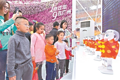 海心沙AI花市現(xiàn)場(chǎng),小朋友聚精會(huì)神地看著機(jī)器人跳舞。廣州日?qǐng)?bào)全媒體攝影記者 蘇俊杰 攝