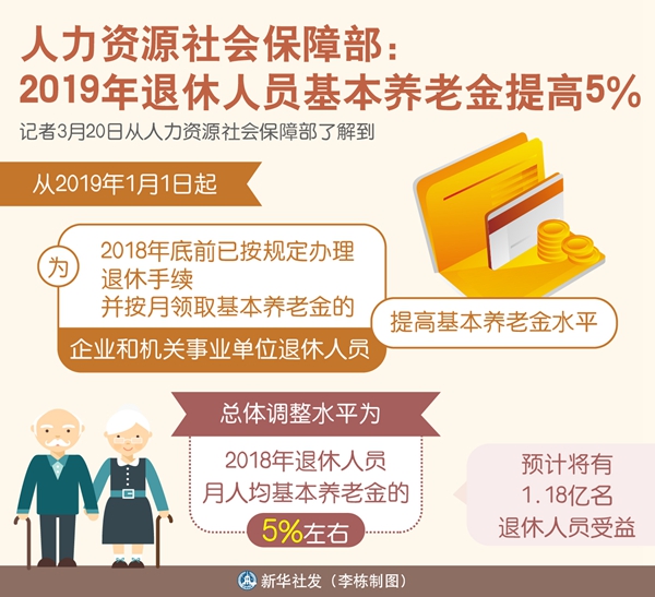 新華社北京3月20日電(記者葉昊鳴)記者20日從人力資源社會保障部了解到,從2019年1月1日起,為2018年底前已按規(guī)定辦理退休手續(xù)并按月領(lǐng)取基本養(yǎng)老金的企業(yè)和機(jī)關(guān)事業(yè)單位退休人員提高基本養(yǎng)老金水平,總體調(diào)整水平為2018年退休人員月人均基本養(yǎng)老金的5%左右,預(yù)計將有1.18億名退休人員受益。