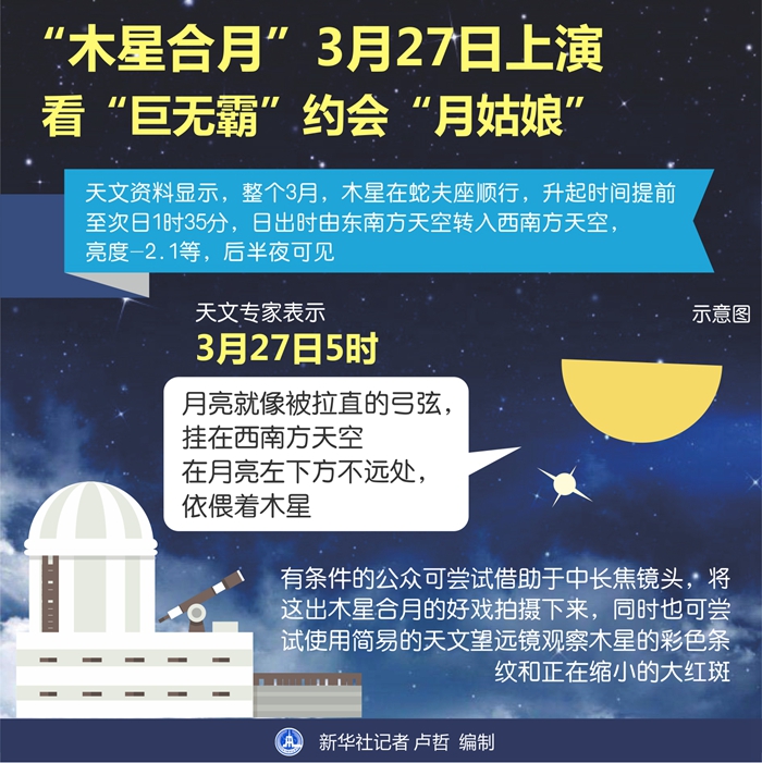 新華社天津3月24日電(記者周潤(rùn)?。├^土星合月、金星合月和火星合月后,本月繁星“逐月”的“浪漫連續(xù)劇”27日繼續(xù)精彩上演,這一次的“男主角”換成了太陽(yáng)系的“巨無(wú)霸”木星。天文專(zhuān)家表示,屆時(shí),如果天氣晴好,有興趣的公眾和早起出行的人們可于當(dāng)日黎明前欣賞到這幕浪漫的“星月童話(huà)”。