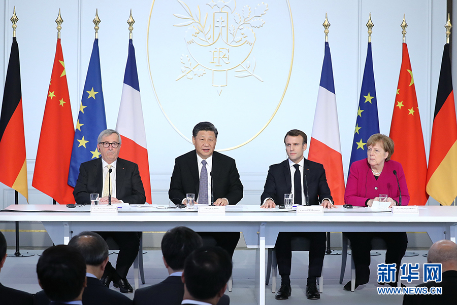 3月26日,國(guó)家主席習(xí)近平在巴黎同法國(guó)總統(tǒng)馬克龍一道出席中法全球治理論壇閉幕式。德國(guó)總理默克爾、歐盟委員會(huì)主席容克應(yīng)邀出席。 新華社記者 鞠鵬 攝