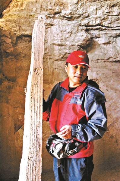 2005年王旭東在新疆樓蘭壁畫(huà)墓做現(xiàn)場(chǎng)搶救性支頂