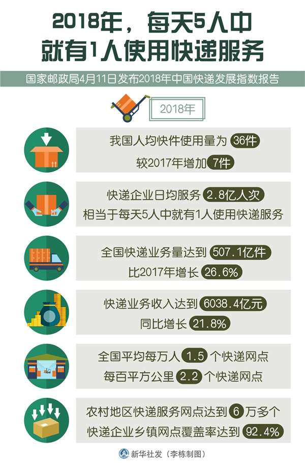 新華網(wǎng)北京4月12日電(記者 李志強(qiáng))11日,國(guó)家郵政局發(fā)布《2018年中國(guó)快遞發(fā)展指數(shù)報(bào)告》(以下簡(jiǎn)稱《報(bào)告》)?!秷?bào)告》顯示,2018年,中國(guó)快遞業(yè)務(wù)量超過(guò)美、日、歐發(fā)達(dá)經(jīng)濟(jì)體之和,規(guī)模連續(xù)五年穩(wěn)居世界第一,成為全球快遞包裹市場(chǎng)發(fā)展的動(dòng)力源和穩(wěn)定器。