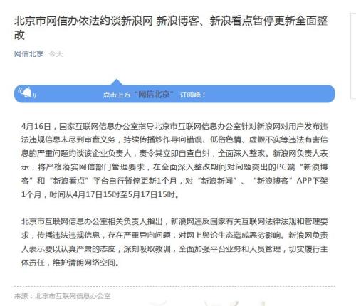 北京市互聯(lián)網(wǎng)信息辦公室相關(guān)負(fù)責(zé)人指出,新浪網(wǎng)違反國家有關(guān)互聯(lián)網(wǎng)法律法規(guī)和管理要求,傳播違法違規(guī)信息,存在嚴(yán)重導(dǎo)向問題,對(duì)網(wǎng)上輿論生態(tài)造成惡劣影響。新浪網(wǎng)負(fù)責(zé)人表示要以認(rèn)真嚴(yán)肅的態(tài)度,深刻吸取教訓(xùn),全面加強(qiáng)平臺(tái)業(yè)務(wù)和人員管理,切實(shí)履行主體責(zé)任,維護(hù)清朗網(wǎng)絡(luò)空間。