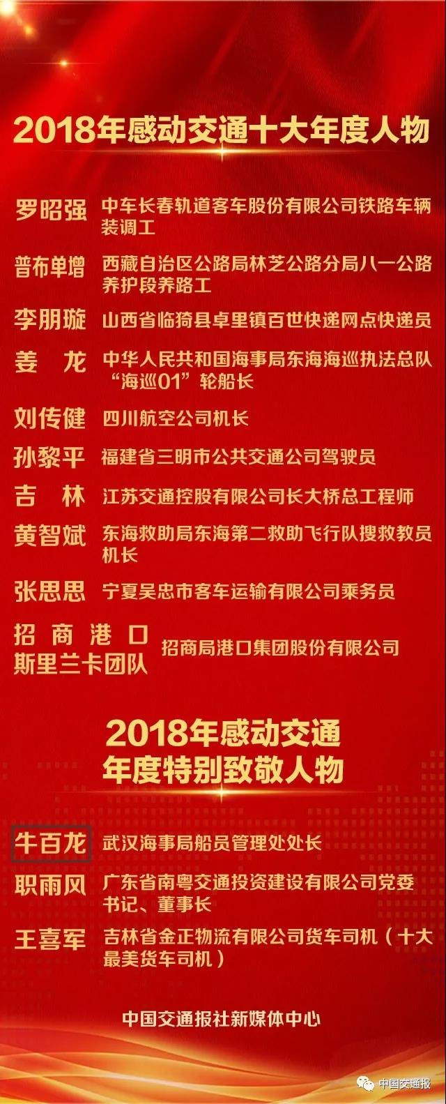 另外,將青春和生命奉獻(xiàn)給海事交通事業(yè)的武漢海事局船員管理處處長牛百龍;胸懷大愛,積極踐行“大道為公”理念的廣東南粵交通投資建設(shè)有限公司黨委書記、董事長職雨風(fēng);400萬公里安全駕駛、細(xì)心工作、熱心助人的吉林省物流貨車司機王喜軍榮獲“2018年感動交通年度特別致敬人物”稱號。