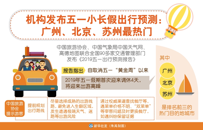 新華社北京4月29日電(記者魯暢)中國(guó)旅游協(xié)會(huì)、中國(guó)氣象局中國(guó)天氣網(wǎng)、高德地圖聯(lián)合全國(guó)90多家交通管理部門發(fā)布《2019五一出行預(yù)測(cè)報(bào)告》,報(bào)告指出,自取消五一“黃金周”以來,今年五一假期首次迎來調(diào)休4天,將迎來出游高峰,其中廣州、北京、蘇州是排名前三的熱門目的地城市。