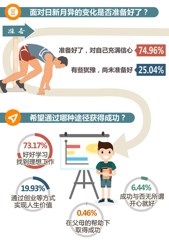 大學(xué)生的自信還體現(xiàn)在希望通過努力獲得成功。93.1%的受訪者希望“好好學(xué)習(xí),從事理想工作”“通過創(chuàng)新、創(chuàng)業(yè)等方式實(shí)現(xiàn)人生價(jià)值”。在采訪中,不少大學(xué)生表示“只要有想法就敢去做”“相信未來有無限可能”。中國(guó)地質(zhì)大學(xué)(北京)信息工程學(xué)院兼職輔導(dǎo)員王洪宇說,現(xiàn)在的大學(xué)生不拘泥于傳統(tǒng),更愿意參與創(chuàng)新創(chuàng)業(yè),他們甚至?xí)约簞?chuàng)立新工種,把青年特質(zhì)發(fā)揮到極致。分析認(rèn)為,這一代大學(xué)生成長(zhǎng)在國(guó)家快速發(fā)展、改革開放不斷深化、國(guó)際地位不斷上升、互聯(lián)網(wǎng)與生活緊密融合的時(shí)代,他們的成長(zhǎng)環(huán)境更加優(yōu)越,視野更加開闊,這對(duì)他們的自我認(rèn)知及性格形成有很大影響,他們更加自信。