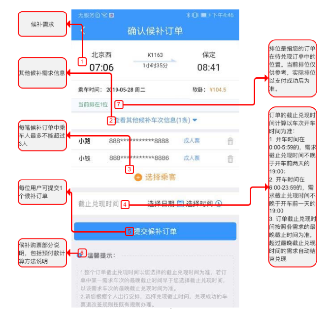 每位用戶可提交1個(gè)候補(bǔ)訂單,1個(gè)訂單中可添加發(fā)到站相同(可以是同城的不同車站)的2個(gè)相鄰的乘車日期,每個(gè)乘車日期可添加2個(gè)不同“車次+席別”的組合需求。