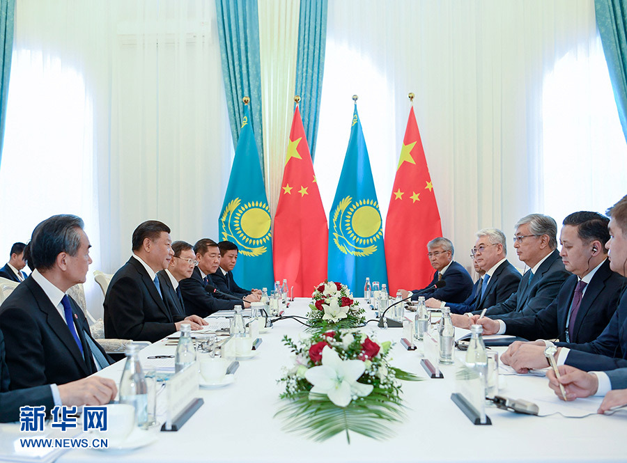6月13日,國家主席習近平在比什凱克會見哈薩克斯坦總統(tǒng)托卡耶夫。 新華社記者 高潔 攝