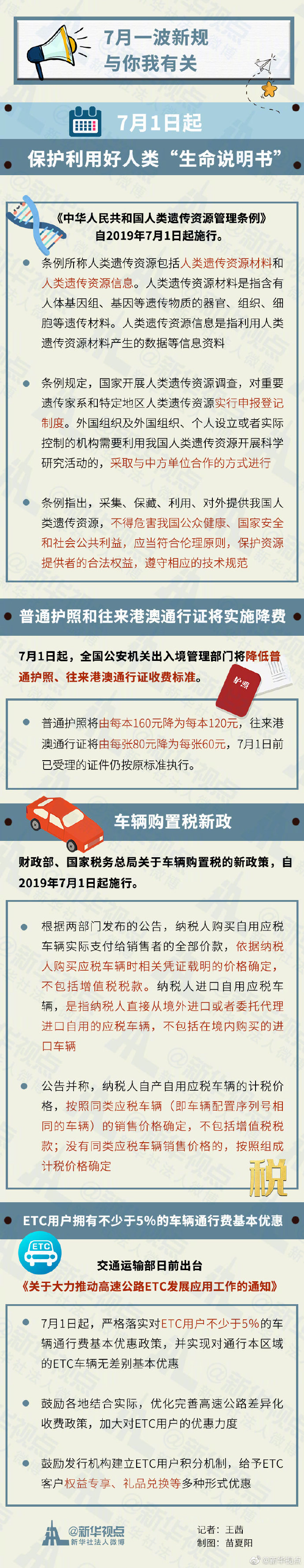 保護(hù)利用好人類“生命說(shuō)明書(shū)”;普通護(hù)照和往來(lái)港澳通行證將實(shí)施降費(fèi);車輛購(gòu)置稅新政7月1日起施行;ETC用戶擁有不少于5%的車輛通行費(fèi)基本優(yōu)惠……7月1日起,一批與你我有關(guān)的新規(guī)將正式施行。戳圖帶你了解干貨??,轉(zhuǎn)發(fā)周知! ????