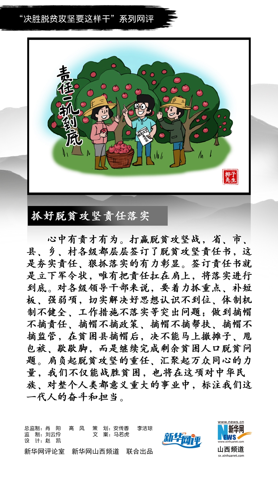 心中有責(zé)才有為。打贏脫貧攻堅戰(zhàn),省、市、縣、鄉(xiāng)、村各級都層層簽訂了脫貧攻堅責(zé)任書,這是夯實(shí)責(zé)任、狠抓落實(shí)的有力彰顯。簽訂責(zé)任書就是立下軍令狀,唯有把責(zé)任扛在肩上,將落實(shí)進(jìn)行到底。對各級領(lǐng)導(dǎo)干部來說,要著力抓重點(diǎn)、補(bǔ)短板、強(qiáng)弱項(xiàng),切實(shí)解決好思想認(rèn)識不到位、體制機(jī)制不健全、工作措施不落實(shí)等突出問題;做到摘帽不摘責(zé)任、摘帽不摘政策、摘帽不摘幫扶、摘帽不摘監(jiān)管,在貧困縣摘帽后,決不能馬上撤攤子、甩包袱、歇歇腳,而是繼續(xù)完成剩余貧困人口脫貧問題。肩負(fù)起脫貧攻堅的重任、匯聚起萬眾同心的力量,我們不僅能戰(zhàn)勝貧困,也將在這項(xiàng)對中華民族、對整個人類都意義重大的事業(yè)中,標(biāo)注我們這一代人的奮斗和擔(dān)當(dāng)。(馬若虎)