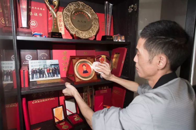 吳元渺在擦拭自己的全國(guó)五一勞動(dòng)獎(jiǎng)?wù)?。柜子里擺放的都是他獲得的各種榮譽(yù)證書(shū)和獎(jiǎng)?wù)隆?/font>