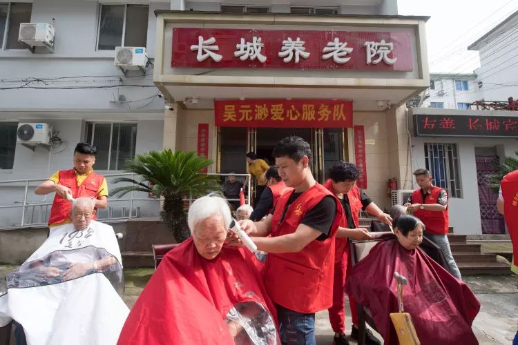 吳元渺愛(ài)心服務(wù)隊(duì)的志愿者們?cè)谂R海市一家養(yǎng)老院為老人義務(wù)理發(fā)。