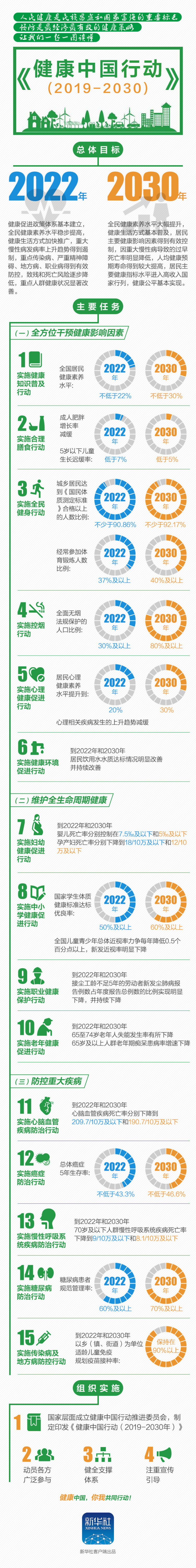 ?。ㄒ唬┘訌娊M織領導。國家層面成立健康中國行動推進委員會,制定印發(fā)《健康中國行動(2019-2030年)》,細化上述15個專項行動的目標、指標、任務和職責分工,統(tǒng)籌指導各地區(qū)各相關部門加強協作,研究疾病的綜合防治策略,做好監(jiān)測考核。要根據醫(yī)學進步和相關技術發(fā)展等情況,適時組織修訂完善《健康中國行動(2019-2030年)》內容。各地區(qū)要結合實際健全領導推進工作機制,研究制定實施方案,逐項抓好任務落實。各相關部門要按照職責分工,將預防為主、防病在先融入各項政策舉措中,研究具體政策措施,推動落實重點任務。