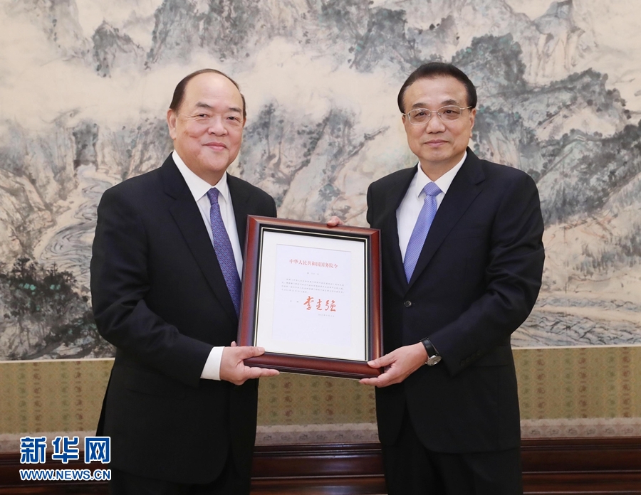 9月11日,國務(wù)院總理李克強在北京中南海紫光閣會見賀一誠,頒發(fā)任命他為中華人民共和國澳門特別行政區(qū)第五任行政長官的國務(wù)院第719號令。 新華社記者 劉衛(wèi)兵 攝