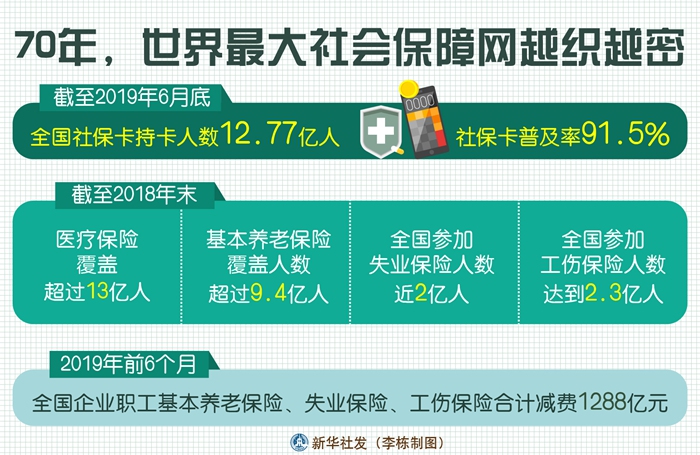1951年2月26日,新中國(guó)成立后第一個(gè)社會(huì)保險(xiǎn)法規(guī)《中華人民共和國(guó)勞動(dòng)保險(xiǎn)條例》頒布。70年來(lái),一系列政策措施頒布實(shí)施,給老百姓帶來(lái)實(shí)實(shí)在在、看得見(jiàn)摸得著的好處。社會(huì)保障不斷加強(qiáng),織就世界最大的社會(huì)保障網(wǎng)。
