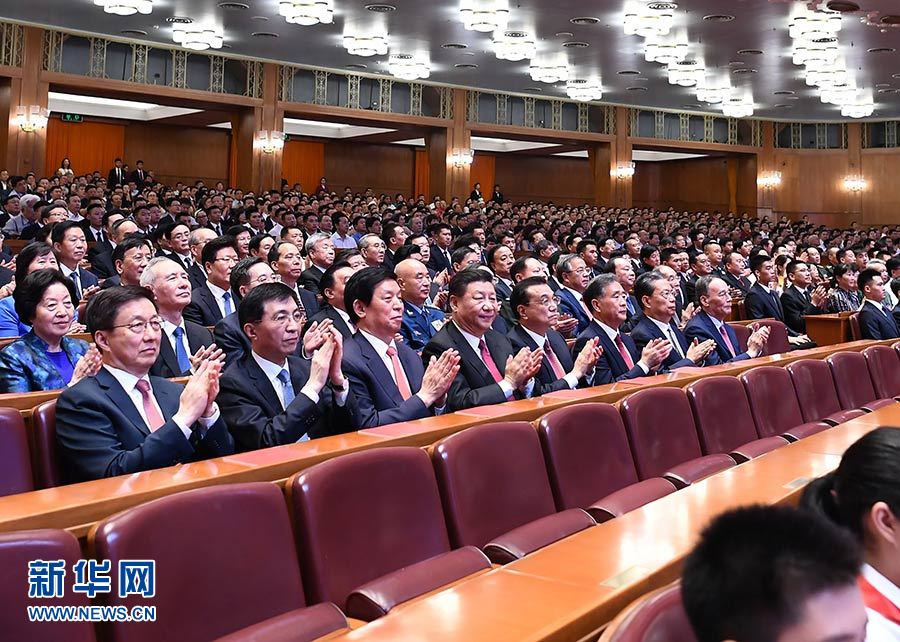 人民大會堂萬人大禮堂處處歡聲笑語。二樓眺臺的橫幅格外醒目:緊密團(tuán)結(jié)在以習(xí)近平同志為核心的黨中央周圍,不忘初心、牢記使命,奮力奪取新時代中國特色社會主義偉大勝利!大會堂天幕上,投映著姹紫嫣紅的鮮花圖案,營造出熱烈喜慶的氣氛。兩面紅旗造型的舞臺墻矗立在臺口,36名儀仗兵分列兩側(cè)。