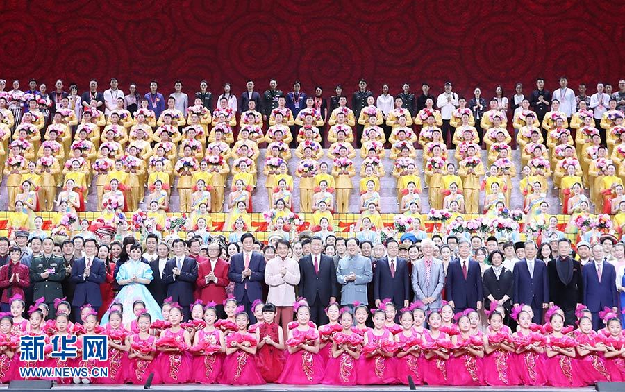 9月29日,慶祝中華人民共和國成立70周年大型文藝晚會《奮斗吧 中華兒女》在北京人民大會堂舉行。習(xí)近平、李克強(qiáng)、栗戰(zhàn)書、汪洋、王滬寧、趙樂際、韓正、王岐山等黨和國家領(lǐng)導(dǎo)人同4000多名觀眾一起觀看演出。演出結(jié)束后,習(xí)近平等走上舞臺同演職人員合影留念。 新華社記者 王曄 攝