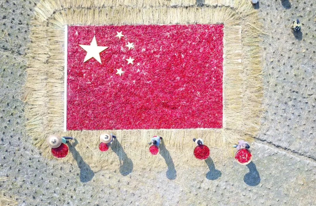 2019年9月30日,貴州凱里。舟溪鎮(zhèn)曼洞村的村民用辣椒拼出國旗圖案,以樸實的方式表達(dá)對祖國的熱愛和美好祝福。作者:紫氣東來
