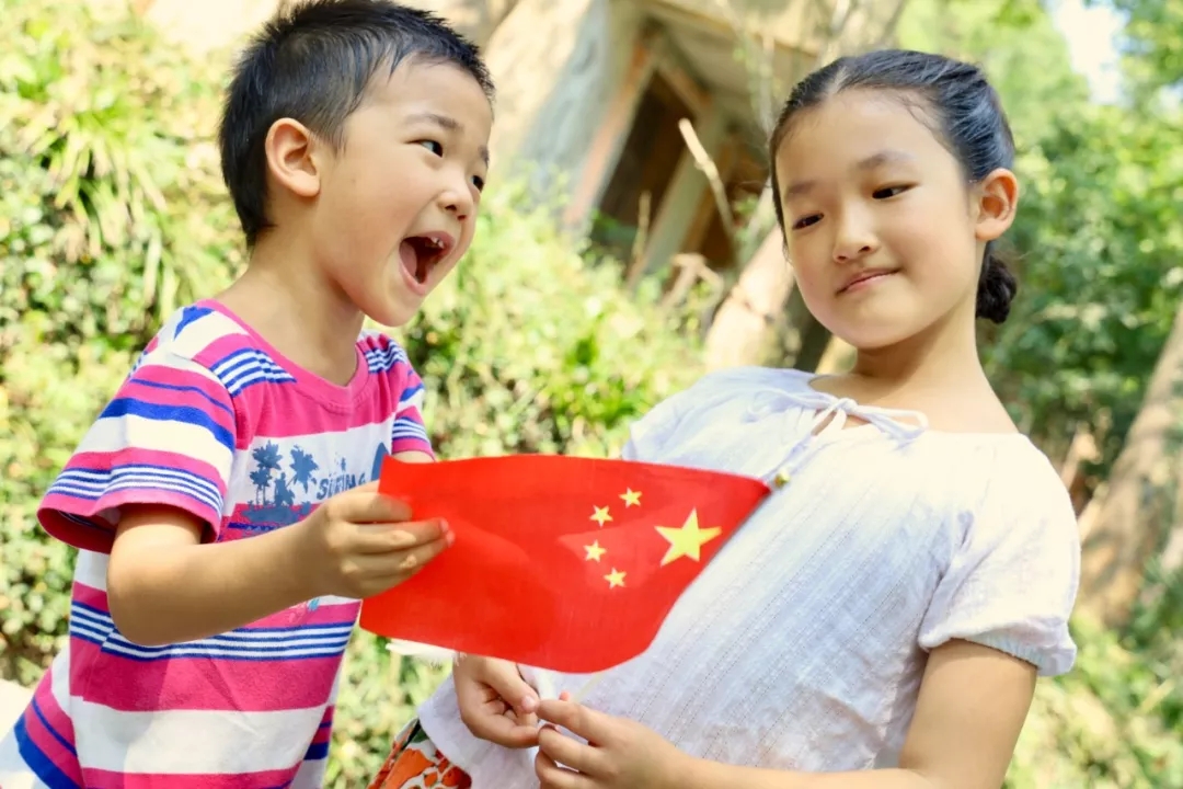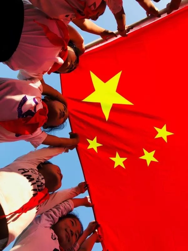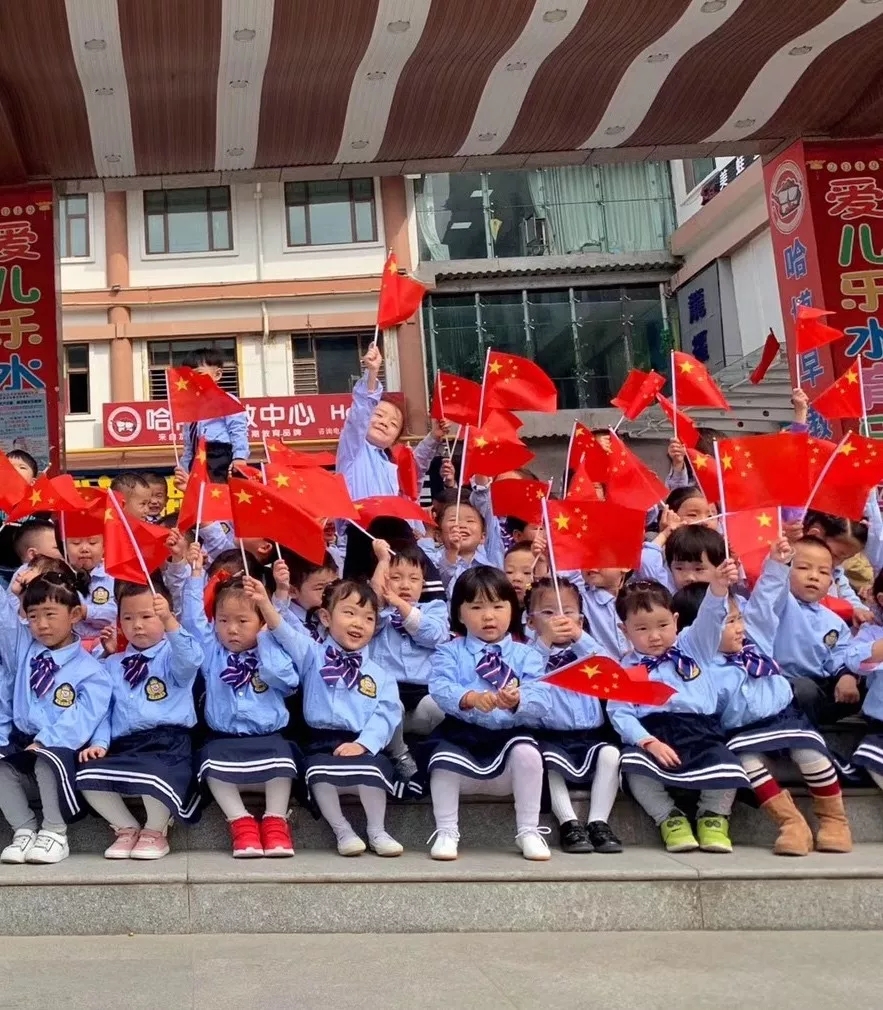 2019年9月28日,甘肅甘谷。幼兒園的小朋友歡快地?fù)]動手中的五星紅旗,祝福祖國生日快樂!作者:草野沐風(fēng)
