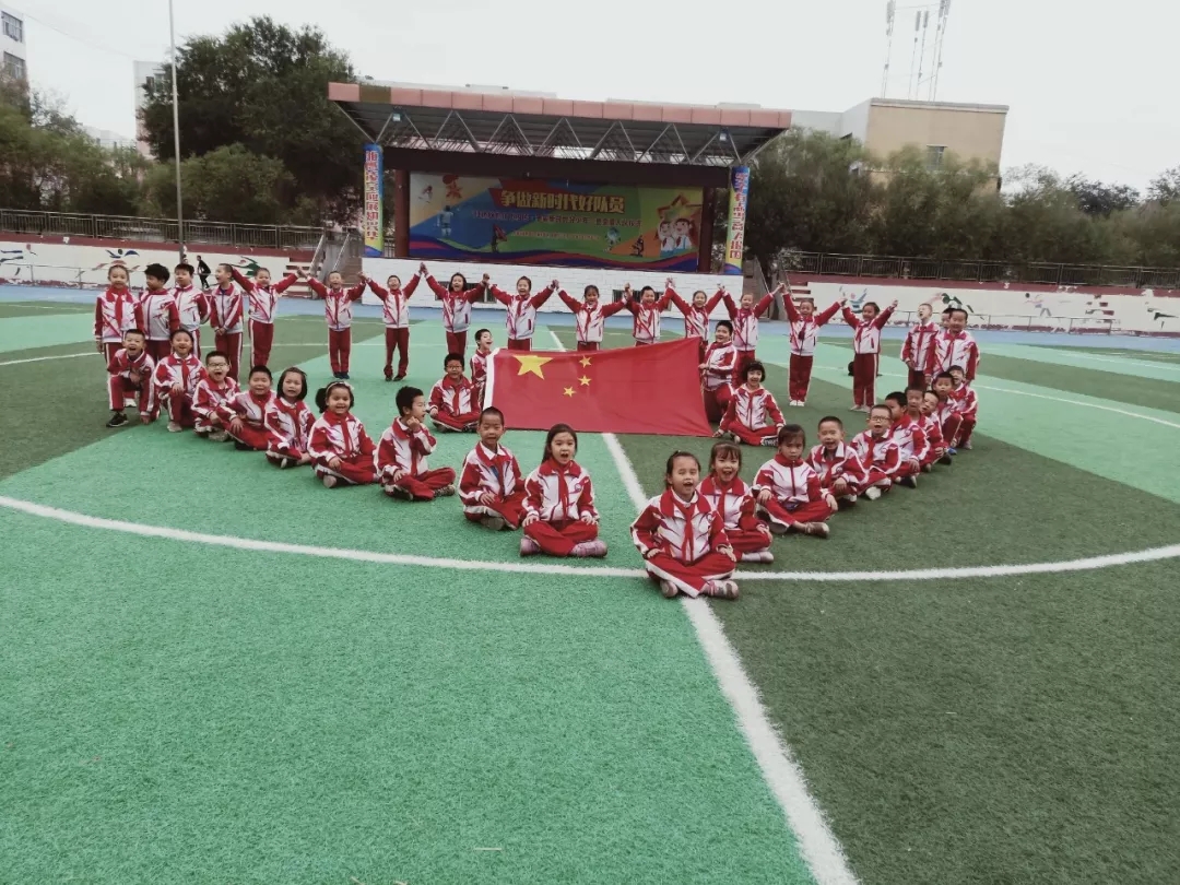 2019年9月26日,江蘇邳州。鐵富鎮(zhèn)中心小學(xué)少先隊員們手擎國旗,祝福祖國生日快樂!作者:時光漫步