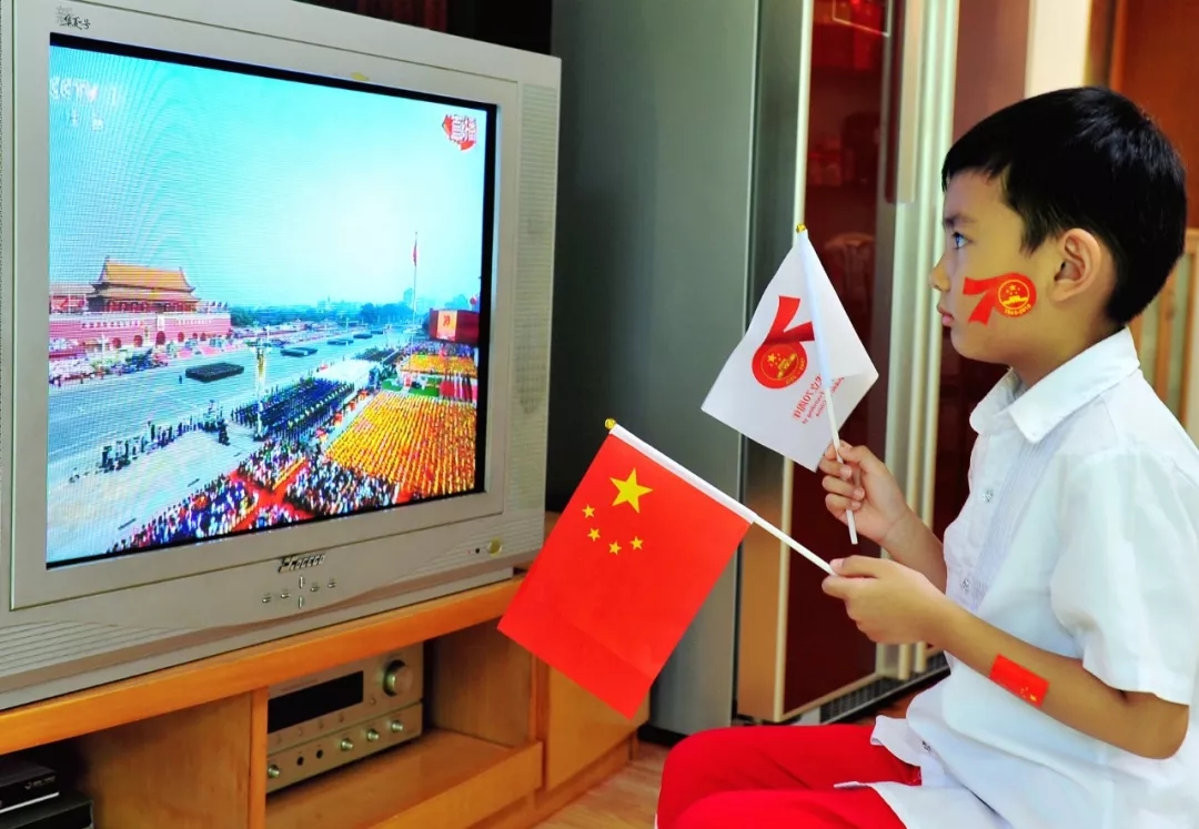 2019年10月1日,福建福州。金山小學(xué)二年級六班的小朋友在家中觀看國慶閱兵現(xiàn)場直播。作者:何江江
