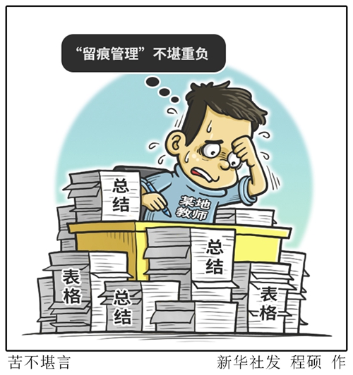 “什么事情都要‘留痕’。”云南一名中學(xué)校長坦言,不少工作流于形式,只注重臺(tái)賬管理、留痕記錄,不管實(shí)際效果?!皯?yīng)付不完的上級(jí)檢查,寫不完的總結(jié),填不完的表格,教師變成了‘表哥’‘表姐’。”一些教師吐槽。