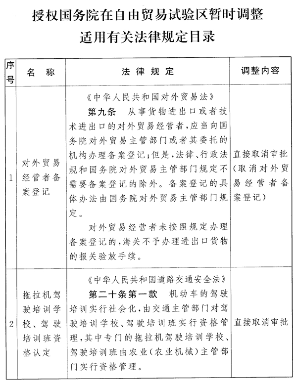 為進(jìn)一步優(yōu)化營(yíng)商環(huán)境,激發(fā)市場(chǎng)活力和社會(huì)創(chuàng)造力,加快政府職能轉(zhuǎn)變,第十三屆全國(guó)人民代表大會(huì)常務(wù)委員會(huì)第十四次會(huì)議決定:授權(quán)國(guó)務(wù)院在自由貿(mào)易試驗(yàn)區(qū)內(nèi),暫時(shí)調(diào)整適用《中華人民共和國(guó)對(duì)外貿(mào)易法》《中華人民共和國(guó)道路交通安全法》《中華人民共和國(guó)消防法》《中華人民共和國(guó)食品安全法》《中華人民共和國(guó)海關(guān)法》《中華人民共和國(guó)種子法》的有關(guān)規(guī)定(目錄附后)。上述調(diào)整在三年內(nèi)試行。對(duì)實(shí)踐證明可行的,國(guó)務(wù)院應(yīng)當(dāng)提出修改有關(guān)法律的意見;對(duì)實(shí)踐證明不宜調(diào)整的,在試點(diǎn)期滿后恢復(fù)施行有關(guān)法律規(guī)定。