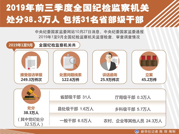 新華社北京10月27日電(記者朱基釵)中央紀委國家監(jiān)委網(wǎng)站27日消息,中央紀委國家監(jiān)委通報2019年1至9月全國紀檢監(jiān)察機關(guān)監(jiān)督檢查、審查調(diào)查情況。2019年1至9月,全國紀檢監(jiān)察機關(guān)共接受信訪舉報249.3萬件次,立案45.2萬件,處分38.3萬人,包括省部級干部31人,廳局級干部0.3萬人。